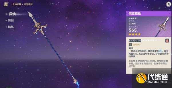 宗室猎枪拥有四星长枪中高档的白字-565,加上魈坐榜第一的全角色基础攻击力,27.6%的大公鸡力收益其实并不差,可以打出较高的伤害上限,当然前提是有合适的暴击率才能愉快玩耍