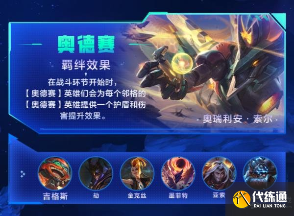 在战斗环节开始时,【奥德赛】英雄们会为每个邻格的【奥德赛】英雄提供一个护盾和伤害提升效果。