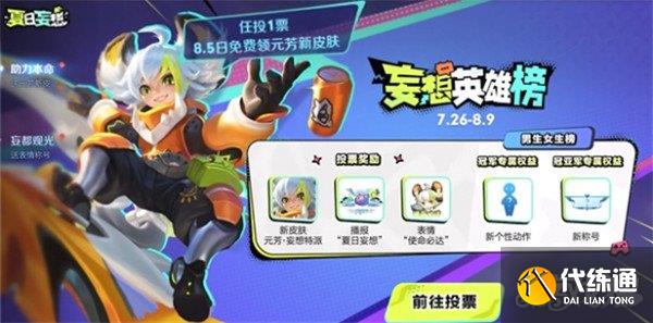 参与并完成活动的海选投票,将会获得专属投票奖励,任投1票8月5日免费领元芳新皮肤,多次参加投票还能得到“夏日妄想”播报和“使命必达”表情。