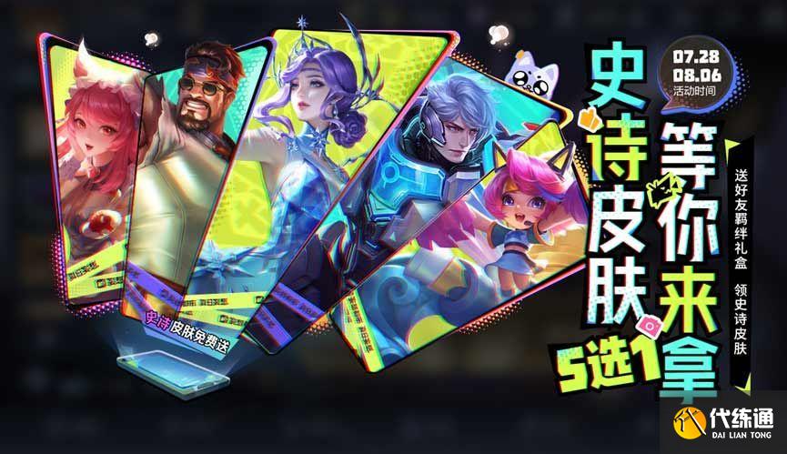 本次可以免费领取史诗皮肤的活动叫做「羁绊之旅、峡谷再续」,该活动7月28日上线,8月6日结束,完成任务后,玩家可以获得一个史诗皮肤自选宝箱,在这个宝箱内有5个免费得史诗皮肤任选,他们分别是: