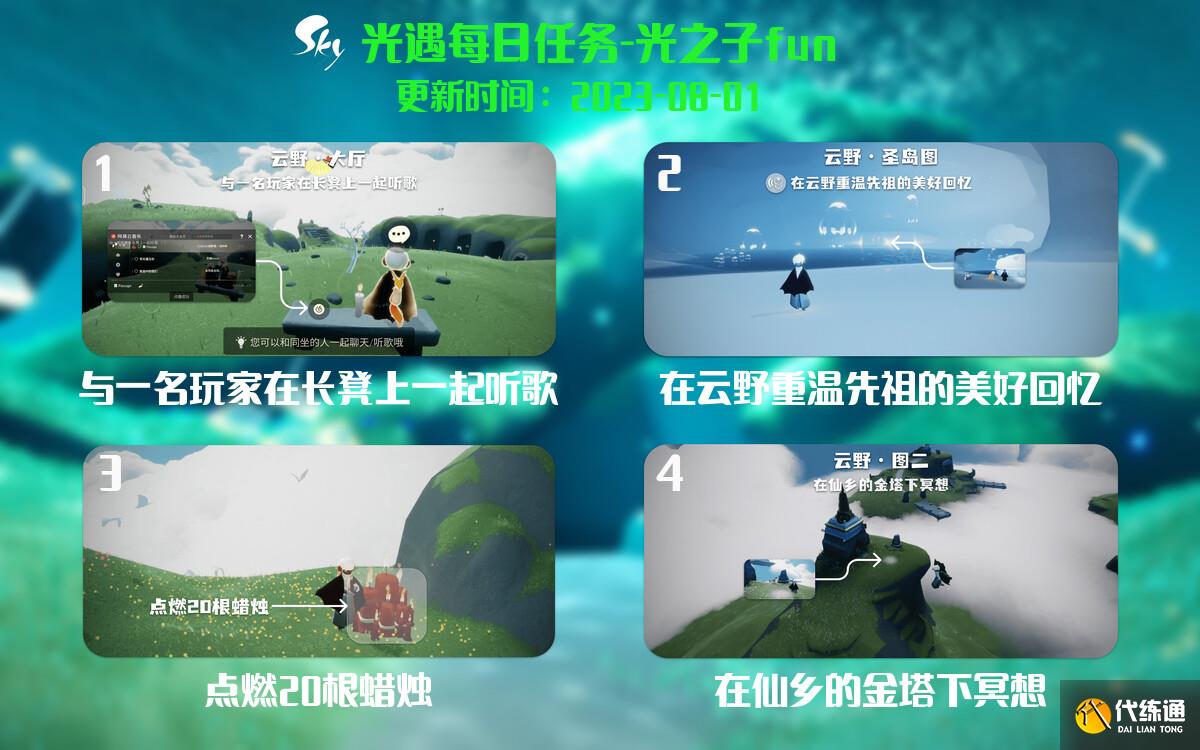 光遇每日任务8月1日完成攻略在这里为大家更新,同时在这里也为各位小伙伴带来最新的季节蜡烛和大蜡烛的具体位置,帮助玩家获取更多的资源,还没有完成任务或者找不到蜡烛位置的玩家就接着往下看吧。