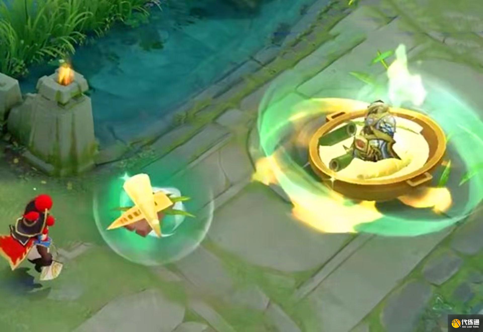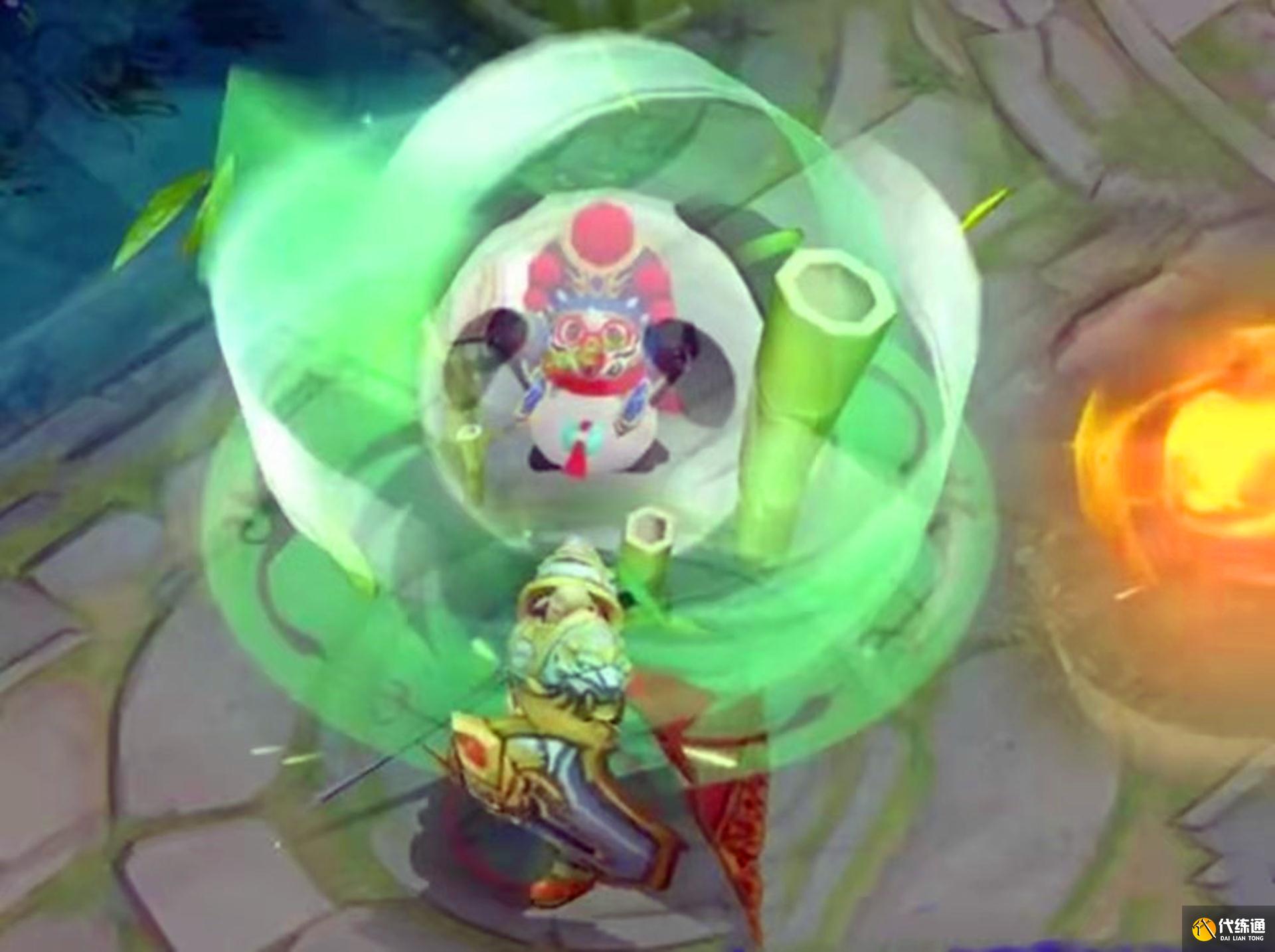 在释放一技能时,胖达荣荣会释放一个绿色的气场,气场中会出现熊猫头,还会有竹子特效显现。