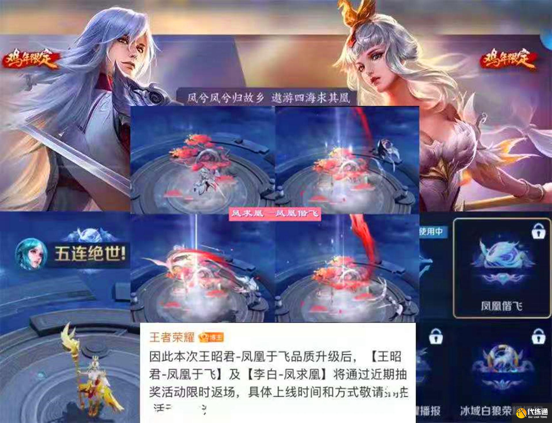 游戏官方同时也宣布,凤求凰和凤凰于飞将在近期进行返场,方式是抽奖概率获取,本周的例行更新(11号)将上线凤凰于飞的优化效果,皮肤返场时间后续游戏官方将公布。