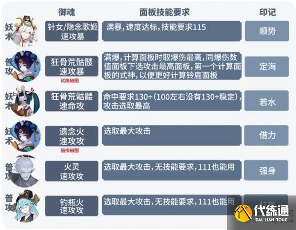 其中SP荒川、SP金鱼姬为可替代式神,换成其他水系式神更好,例如海忍(锁3技能)海坊主普攻会动画更快,同样的提供攻击面板也有所缩减,需要试炼式神高面板才可以替换,不追求极致通关速度的可以使用SSR/SP工具人。