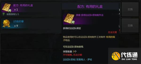 下一步需要在领地商人处购买配方,花费7500讨伐印章(黄色货币),如果自己家没刷可以问问朋友家刷没刷也可以购买;