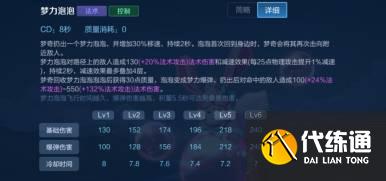 扔出二技能会增加30%移速,首次回到身边时,会再次击打附近敌人,泡泡对敌人造成伤害并且减速.。梦奇回收泡泡之后会获得30能量,再次扔出之后会造成高额伤害。