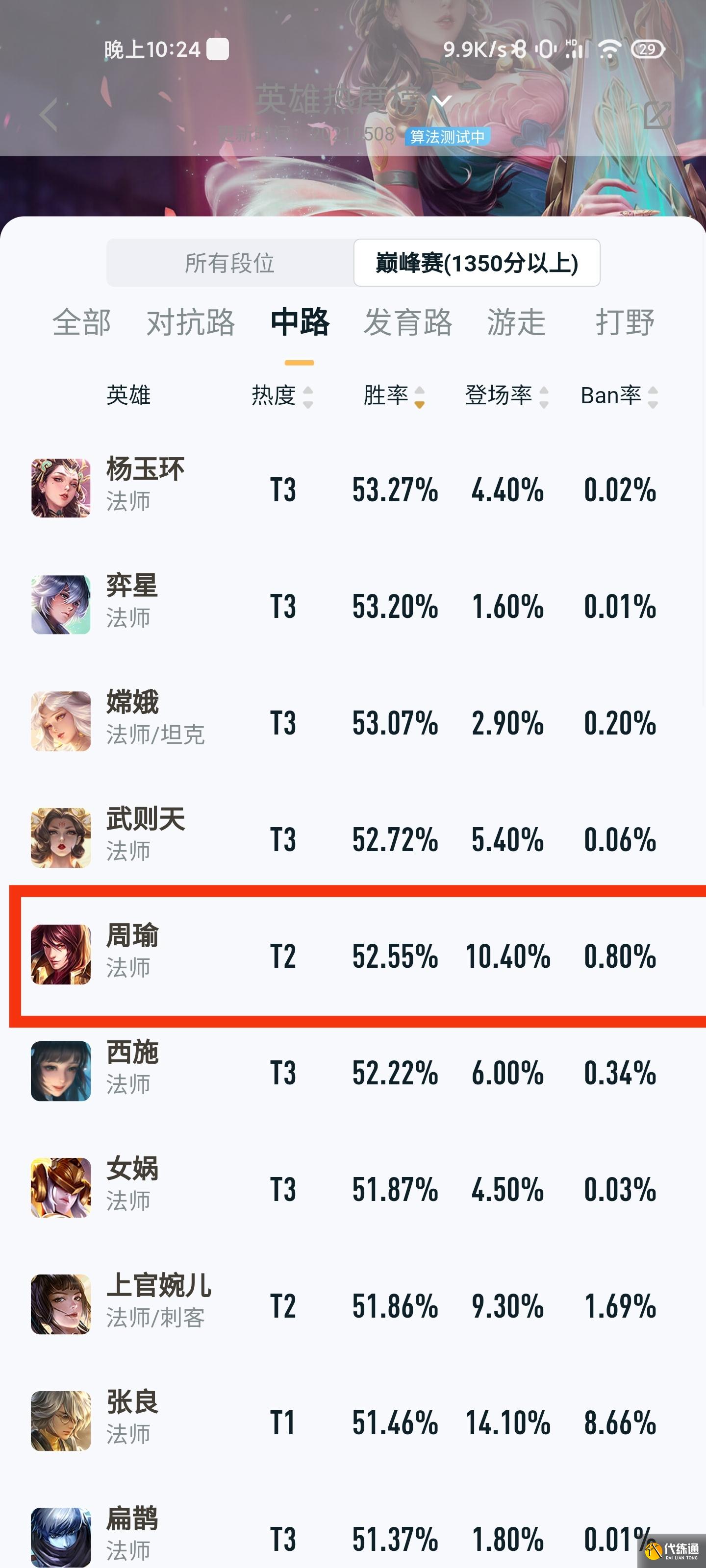 最后我给大家推荐一个英雄,他就是周瑜,他就是我要说的版本答案,这个英雄有控制,有续航,抢线快,能磨塔。在保证自身坦度的同时还能打出很高的伤害,打出很强的压制力,如果上分有困难的玩家可以试试用周瑜上分,不过3还是得有一定的熟练度才拿去打排位哦,不然还是没法上分的,看着这较高的出场率和胜率就可以知道有多少人拿他上分。