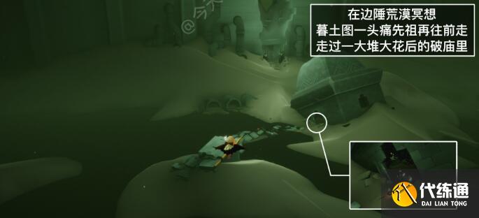 在暮土一图的一大堆花前面的破庙内的石碑前光圈处打坐并留言