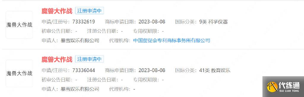 国家知识产权局商标局网显示,暴雪娱乐于8月8日为《魔兽》手游申请了「魔兽大作战」商标,目前申请正在受理中。
