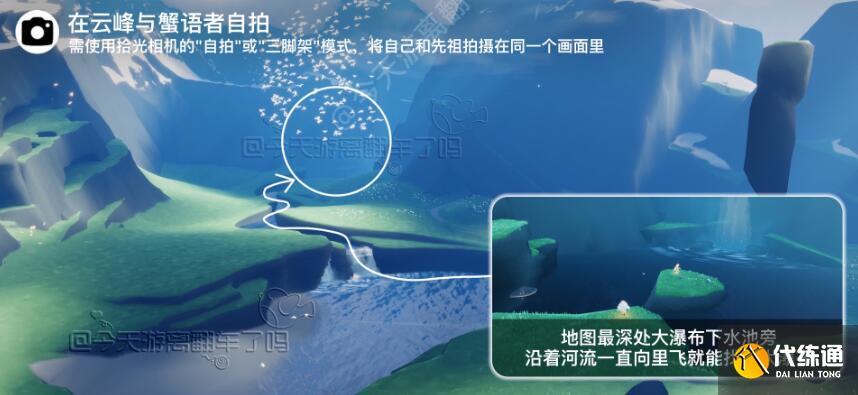 【使用相机背饰】和【在云峰】的蟹语者自拍,先祖位于地图最深处大瀑布下的水池旁