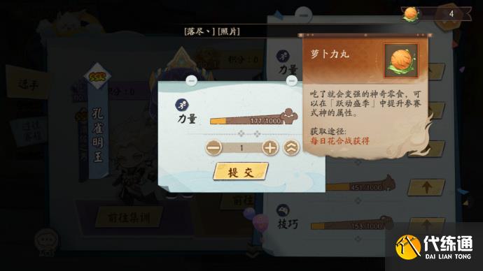 1、「萝卜力丸」:可以集训参赛式神,提升其属性