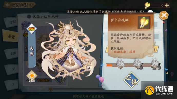 ?小技巧:点开应援后,式神立绘左侧勾选喜欢,下次可以直接在「喜爱」那栏里给式神捐赠应援棒了。