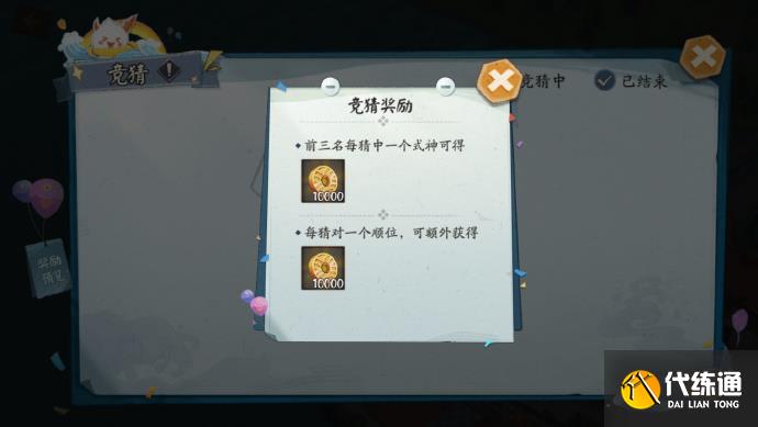 ?赛前竞猜:比赛前一天至开赛前30分钟可以竞猜本场比赛的前3名,竞猜奖励很少,猜对本场比赛全部式神+名次最多获得6w金币。(跃动手册有竞猜10次的任务,友友们记得参加)
