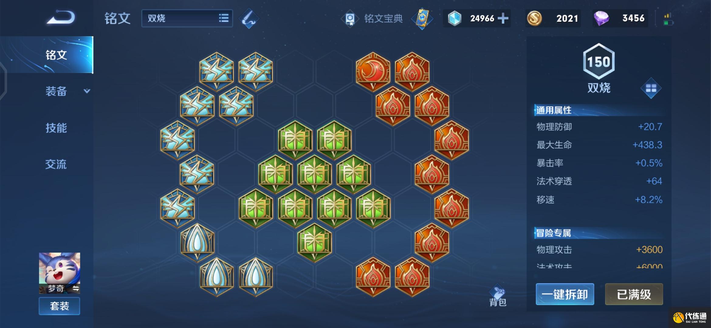 这套铭文在满级时卡到37.6%的攻速阈值,保留一定的刷盾能力;8.2%的移速有助于黏人;438.3的最大生命值配合双烧。