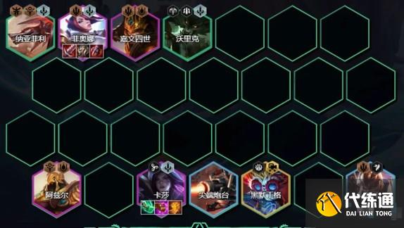 1、阵容成员:菲奥娜、纳亚菲利、嘉文四世、沃里克、阿兹尔、卡莎、尖嘴炮台、黑默丁格、奎因