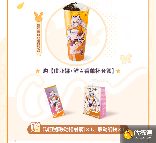 1.购买单杯联名套餐【琪亚娜·鲜百香联名主题饮品】即可获赠【琪亚娜联动镭射票】x1以及【联名纸袋】x1。