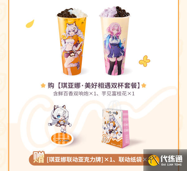 3.购买双杯联名套餐【琪亚娜·美好相遇双杯套餐】即可获赠【琪亚娜联动亚克力牌】x1以及【联名纸袋】x1。