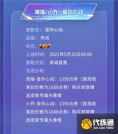 此外5月20日还将上线“五点二十分礼包”,可以2520点券的优惠价格购买周瑜-音你心动和小乔-音你心动两款皮肤。
