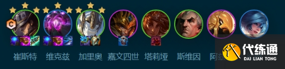 3-2升六人口。大D出4术士3德玛西亚。二星卡牌和二星加里奥。之后在六人口慢D出三星卡牌和三星加里奥。七人口补出乌鸦,皇子替换波比。八人口补出沙皇开出4司令。