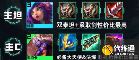 妮蔻的装备优先考虑是双泰坦和汲取剑,如果没有汲取剑可以考虑用科技枪刃代替,但是从坦度而言,汲取剑给妮蔻提供的坦度大于科技枪。