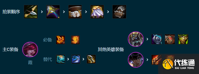 霞作为主C,尽可能装备提供更多的攻击力,因为艾欧尼亚自带回蓝,征服者自带技能暴击,狗头带了薄暮法袍可以破甲,副C妮菈攻速装备和吸血即可