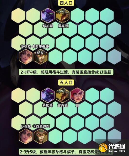 2-3升5级,根据阵容补格斗棋子,有雷克赛优先开4格斗,后排莎弥拉蛇女选择质量低的先下;