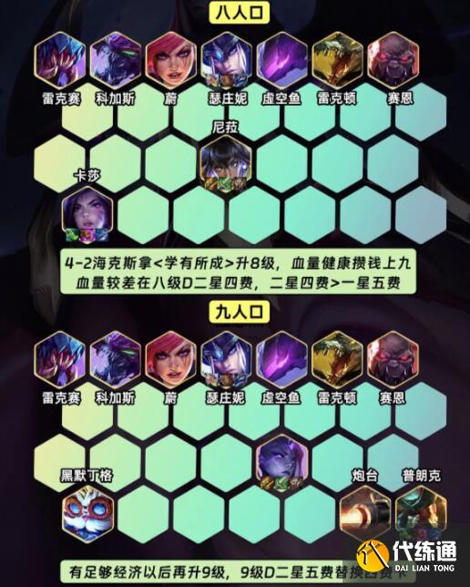 有足够经济后再升9级,9级需要留30左右金币D牌,D到二星五费卡替换四费;