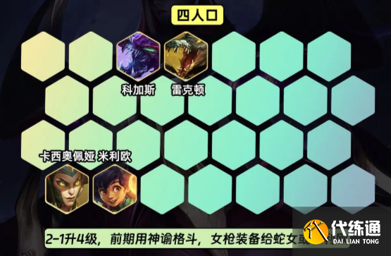 2-1升4级,前期可以用神谕搭配格斗过渡,阿兹尔装备给蛇女,女枪装备给米利欧;