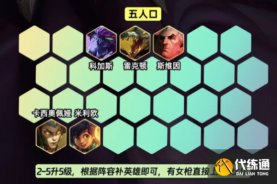 2-3升5级,根据阵容补格斗棋子,有女枪换米利欧优先开3比尔吉沃特;