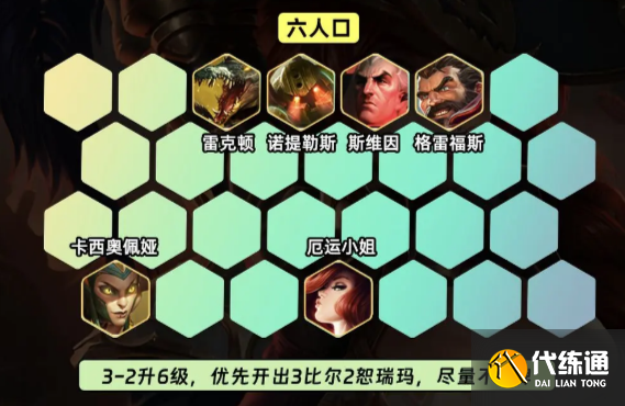 3-2升6级,6级优先开出3比尔吉沃特2司令2恕瑞玛,尽量不D牌;