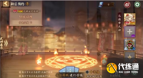 预抽式神:新区集结期间,预约抽卡SP/SSR概率提升,首次十连召唤,和之后的每60次召唤必得SP/SSR,大人每天还可免费获得30次召唤机会(上限150次),每日分享可额外获得10次免费召唤(上限30次),并可从已召唤的式神中选择携带3位进入新区