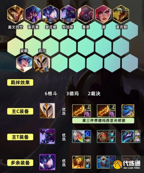 有足够经济后直接升9级,9级开出完全体阵容6格斗3德玛2裁决