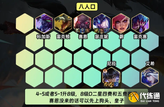 4-5/5-1升8级,8级D阵容二星四费和五费赛恩,赛恩没来可以先上狗头和皇子