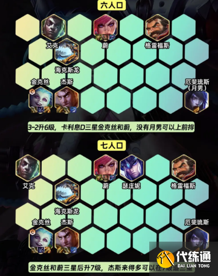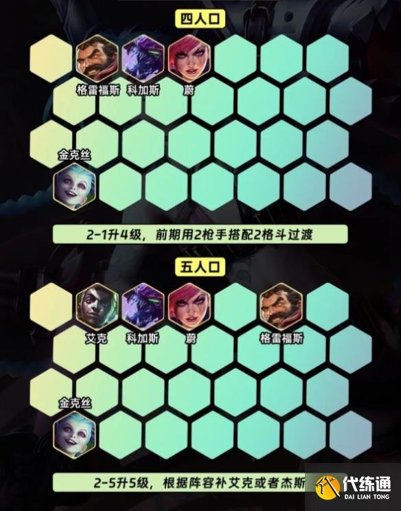 2-5升5级,5级根据阵容补杰斯或者艾克