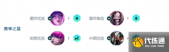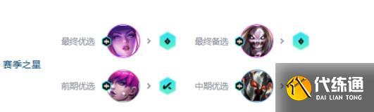 3、前期可以先拿伊芙琳的赛季之星打工,中期如果看到铁男可以拿下来,最终还是要找阿卡丽的赛季之星。