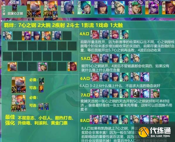 5、心之钢羁绊根据每个阶段来提升奖励,前期2/3阶段不需要开,尽量连胜稳血,4/5阶段后找到凯隐开出5/7心之钢连败4波再开奖励就可以达到最大化收益了。
