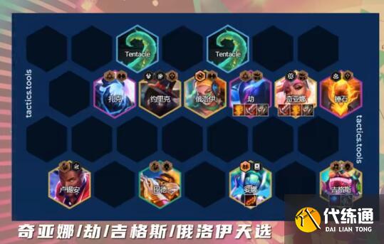 建议使用奇亚娜/劫/吉格斯/俄洛伊天选,搭配下图角色可以组成最强阵容。