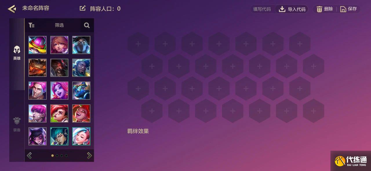 新建阵容进入到阵容编辑界面,左上角可以看到一个导入代码,这里直接点击就会自动导入你复制中的代码,然后就可以看到阵容信息了,你还可以自己调整下,没问题点击保存即可,保存通常会因为阵容数满了,大家基本没开月卡就只有三个阵容位,你要替换掉一个你不用的阵容就行。
