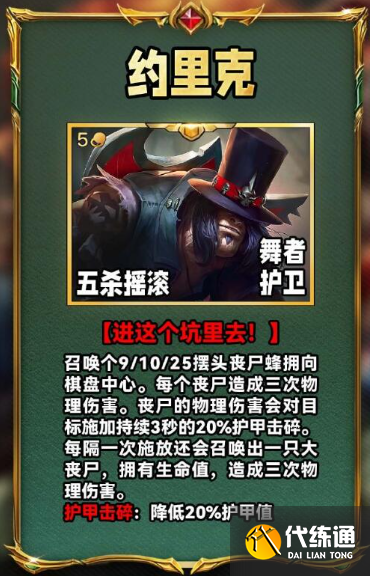技能效果:召唤个9/10/25摆头丧尸蜂拥向棋盘中心。每个丧尸造成三次物理伤害。丧尸的物理伤害会对目标施加持续3秒的20%护甲击碎。每隔一次施放还会召唤出一只大丧尸,拥有生命值,造成三次物理伤害。