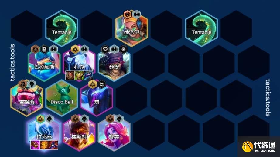 扎克前排带肉装抗伤,提升生存能力也可以利用电子舞曲羁绊打出不俗的伤害。