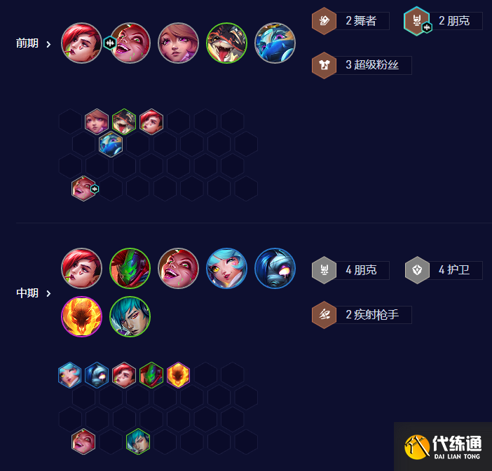 每回合都用朋克的1回合D牌D一次,然后存钱,打完石头人后大D一波金克丝三星,金克丝三星后,上人口,在6级追三星潘森,潘森3星后,上人口开高护卫和疾射枪手