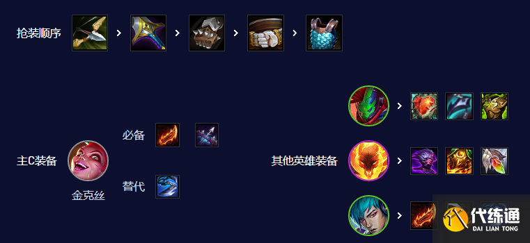 优先做金克丝的轻语和前排装备,前排有2件后再去做金克丝的三神装