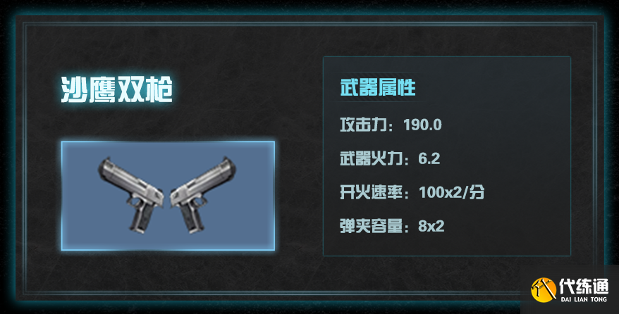 灵活性高射速快的沙鹰双枪,拥有着超高的起始攻击力190.0,通关副本的绝佳武器选择。
