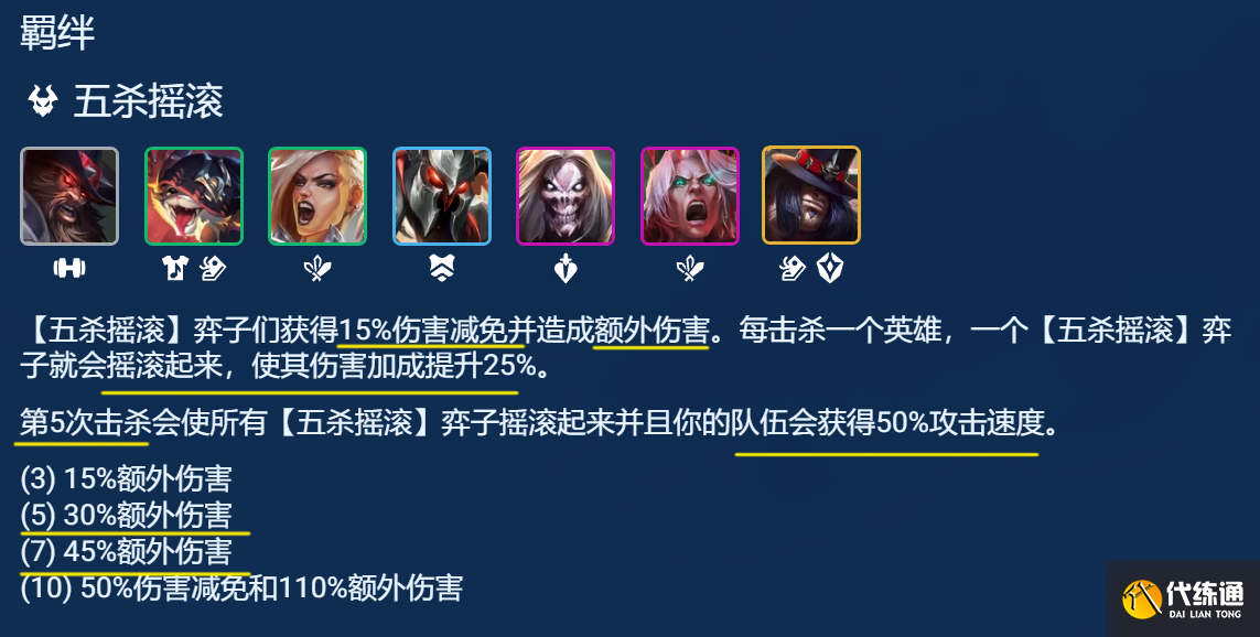 五杀摇滚羁绊的弈子获得一个15%的伤害减免,大幅度增加了五杀摇滚弈子的坦度,另一方面还能增加一个额外伤害,保证了阵容的输出强度,五杀弈子在击杀一名敌方弈子后会使其中一枚五杀弈子摇滚起来,并且伤害额外提升25%,5次击杀后会使其所有五杀弈子摇滚起来,并且为队伍提供50%攻击速度,加大幅度增加了阵容的输出强度与频率。