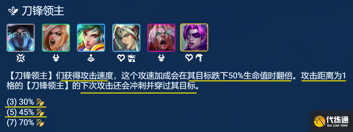 刀锋领主羁绊的弈子们获得攻击速度,并且这个攻速加成在50%时翻倍,大幅度提升了刀锋领主弈子的输出频率,特别是前排的刀锋弈子(1攻击距离),下次攻击还会冲刺并穿过目标,可以越过敌方前排直接威胁到敌方后排。