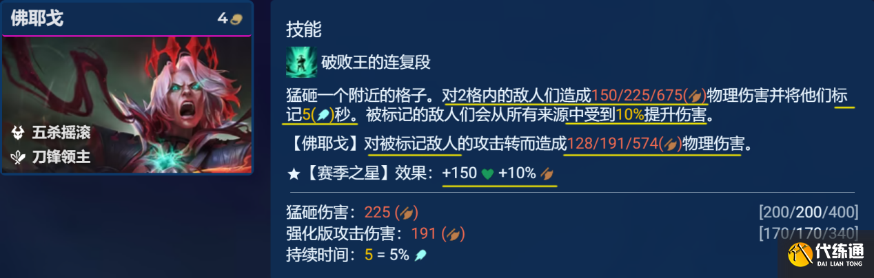 这套阵容的主c是佛爷戈,这版本佛爷戈被大加强,技能攻击力收益150%提升到200%,且佛爷戈技能范围比较大(2格),在触发刀锋领主冲刺效果后,能越过前排,释放技能可直接威胁敌方后排弈子,另一方面佛爷戈的技能对命中敌方弈子会施加持续5秒的10%易伤,不仅增加全队输出收益,佛爷戈还能对被易伤的敌方弈子还会附加物理伤害。