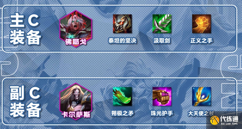 小贴士:多余物理装备给予约里克与琪亚娜,多余法系装备给予凯影。阵容副C并非一定要卡尔萨斯,后期约里克、奇亚娜与凯隐都能充当副C。