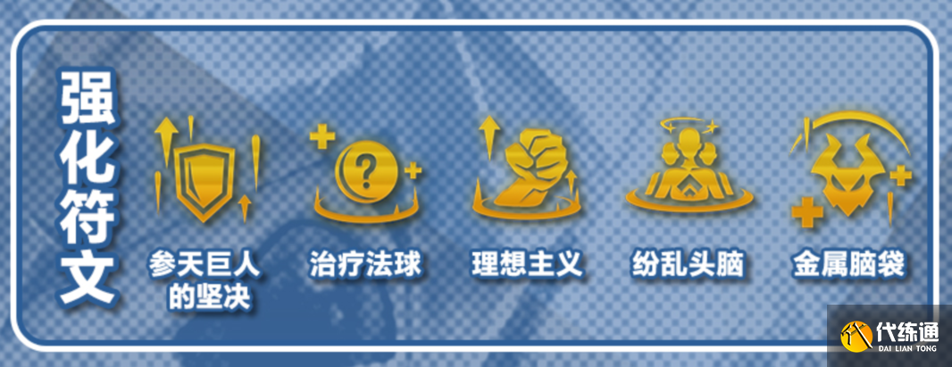 比较优质的符文:参天巨人的坚决、治疗法球、理想主义、纷乱头脑、金属脑袋。