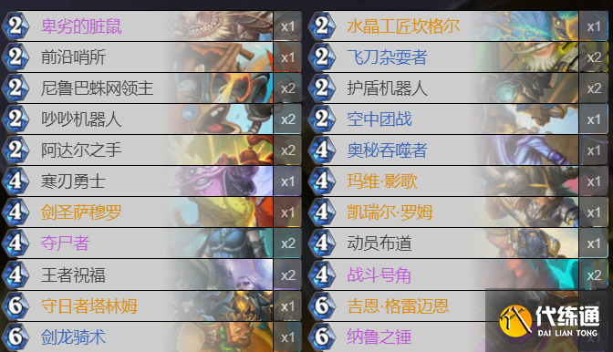 在对阵快攻卡组时,主要是留下水晶工匠坎格尔这类优质低费圣盾随从为主,在四费以上的卡方面,夺尸者,夺尸者的卡牌效果可以被这套圣盾体系发挥到最大,另外王者祝福加剑圣也是一个对阵快攻非常强的组合技,基本一出就是劝退。