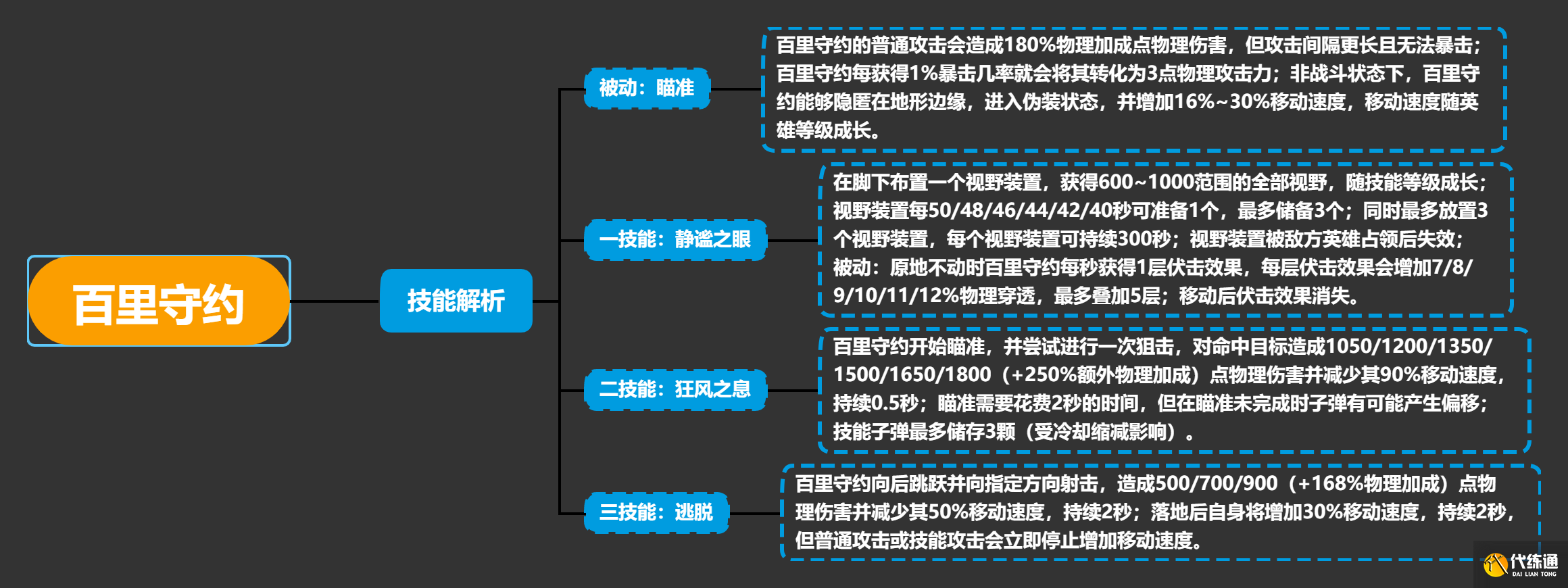 1技能除了能够放置在地上给团队带来视野之外,还拥有一个静止时增加伏击效果的物穿能力,什么是伏击效果呢?也就是说百里狙击前原地站立5秒钟会额外提升12%物理穿透,所以利用好这个技能的话,可能三枪干掉一个坦克也是有可能的哦~